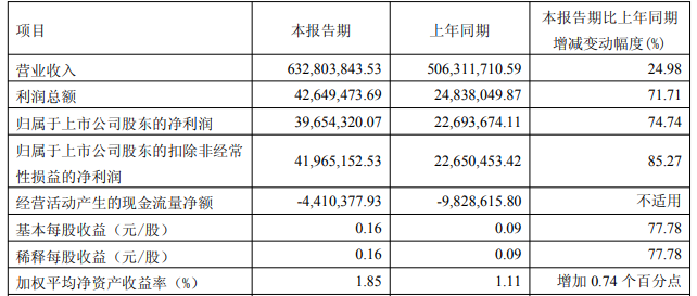 中证智能财讯海星股份(603115)4月18日披露2026年第一季度报告。公司实现营业总收入6.33亿元,同比增长24.98%;归母净利润3965.43万元,同比增长74.74%;扣非净利润4196.52万元,同比增长85.27%;经营活动产生的现金流量净额为-441.04万元,上年同期为-982.86万元;报告期内,海星股份基本每股收益为0.16元,加权平均净资产收益率为1.85%。