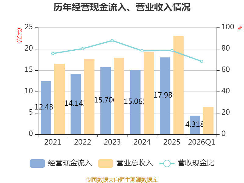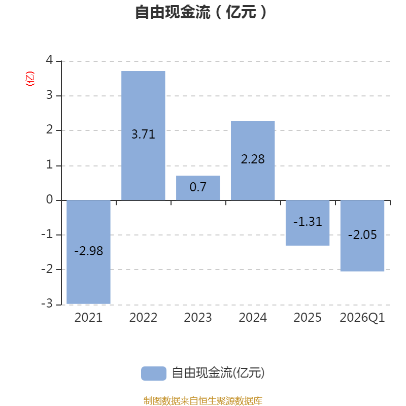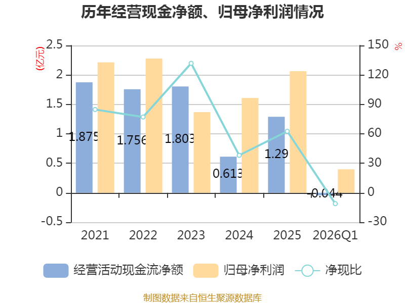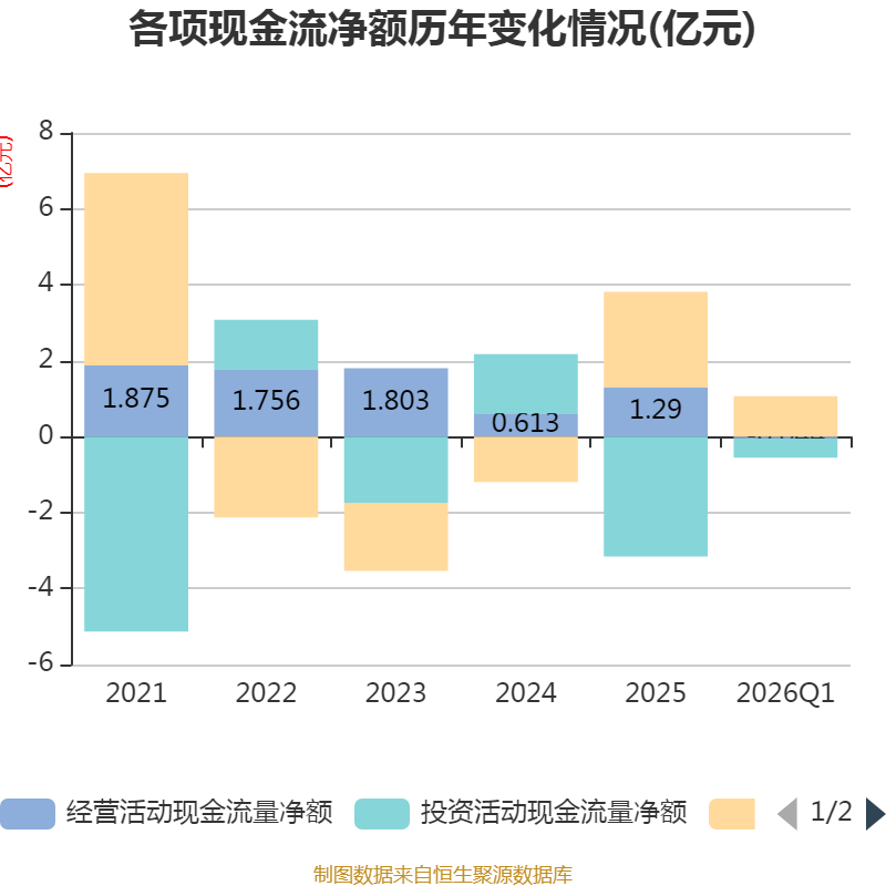 截至2026年一季度末,公司经营活动现金流净额为-441.04万元,同比增加541.82万元;筹资活动现金流净额1.06亿元,同比增加8149.19万元;投资活动现金流净额-5096.72万元,上年同期为-8383.07万元。