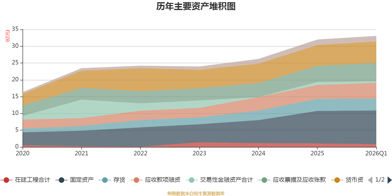 资产重大变化方面,截至2026年一季度末,公司应收票据及应收账款较上年末增加13.82%,占公司总资产比重上升1.52个百分点;交易性金融资产合计较上年末减少49.65%,占公司总资产比重下降1.43个百分点;应收款项融资较上年末增加13.1%,占公司总资产比重上升1.22个百分点;在建工程合计较上年末减少18.9%,占公司总资产比重下降0.69个百分点。