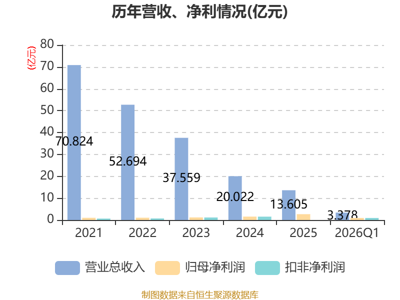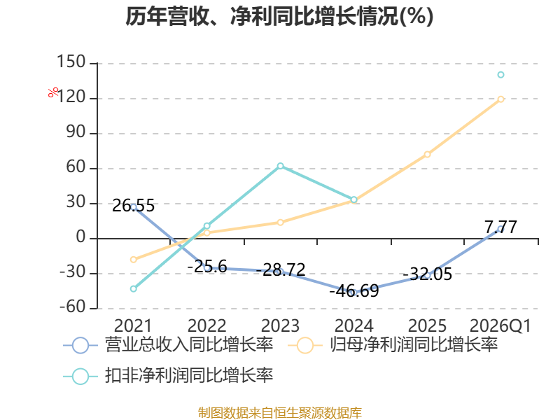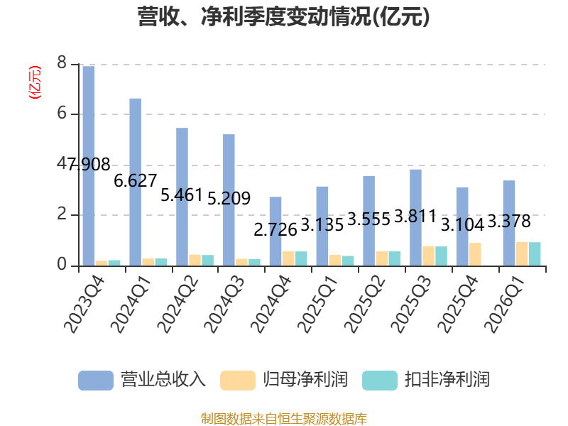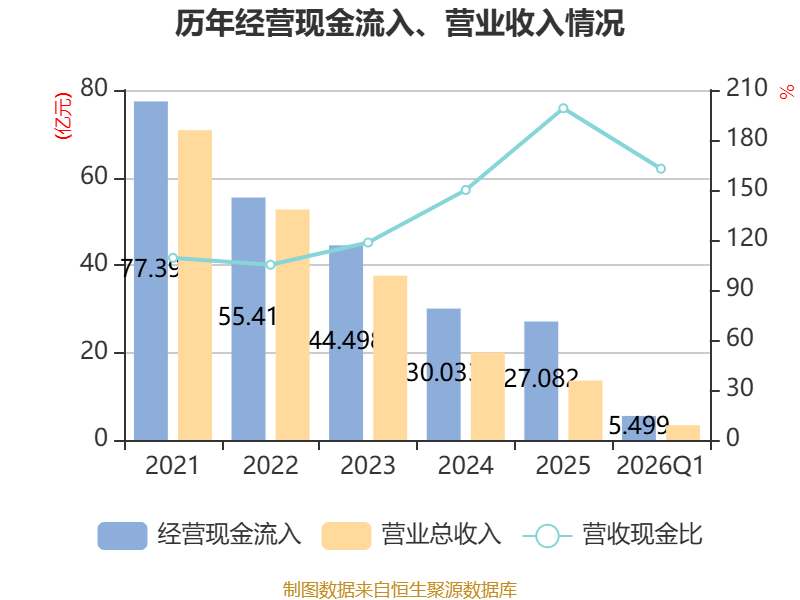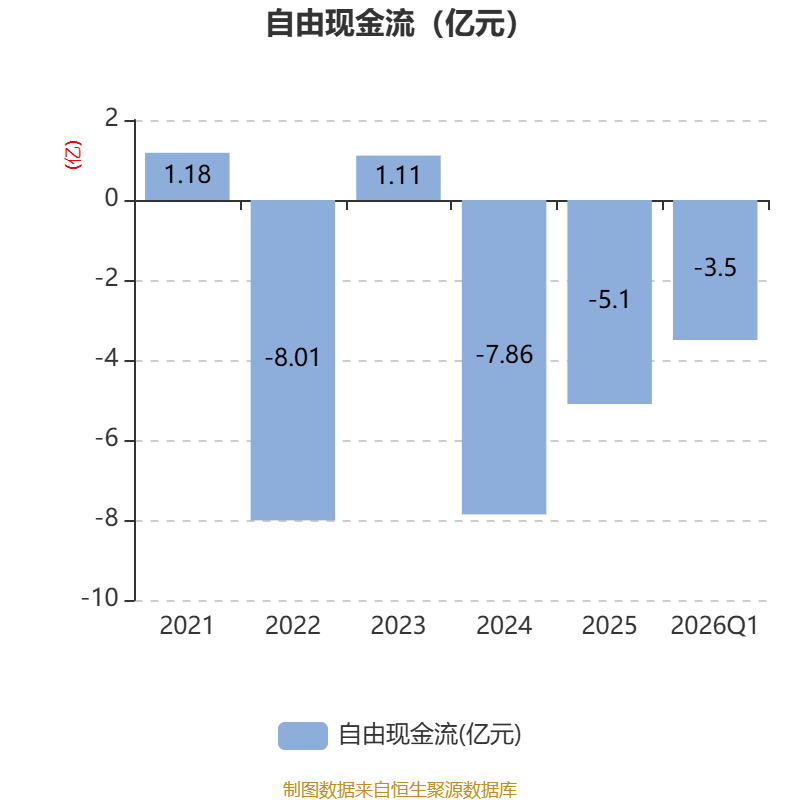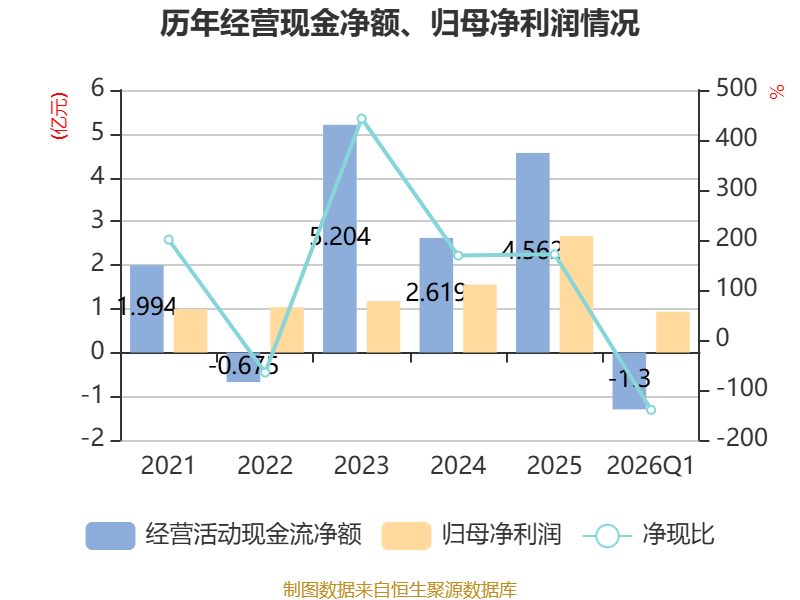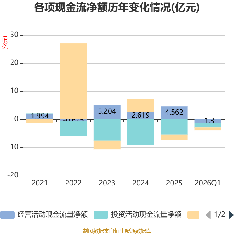 截至2026年一季度末,公司经营活动现金流净额为-1.3亿元,同比减少3550.04万元;筹资活动现金流净额-1.12亿元,同比减少8799.12万元;投资活动现金流净额-1.54亿元,上年同期为-2.19亿元。