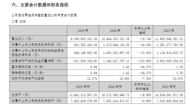 4月17日盘后,索菲亚发布2025年年度报告。数据显示,2025年,公司实现营业收入93.67亿元,同比减少10.74%;归属于上市公司股东的净利润(下称“归母净利润”)9.01亿元,同比减少34.26%。