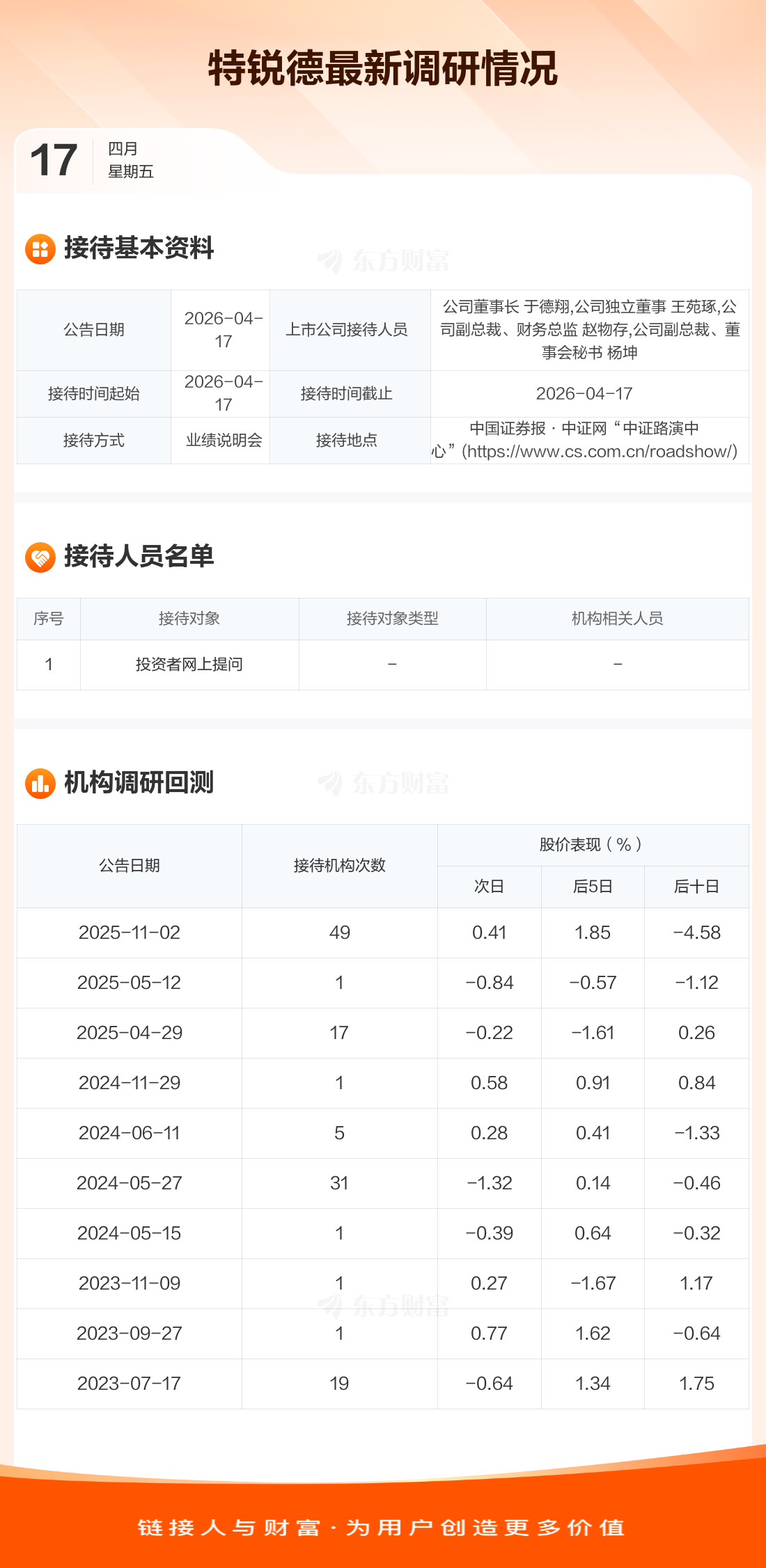 特锐德4月17日公告称,4月17日接待投资者网上提问调研。接待人员包括公司董事长 于德翔,公司独立董事 王苑琢,公司副总裁、财务总监 赵物存,公司副总裁、董事会秘书 杨坤。
