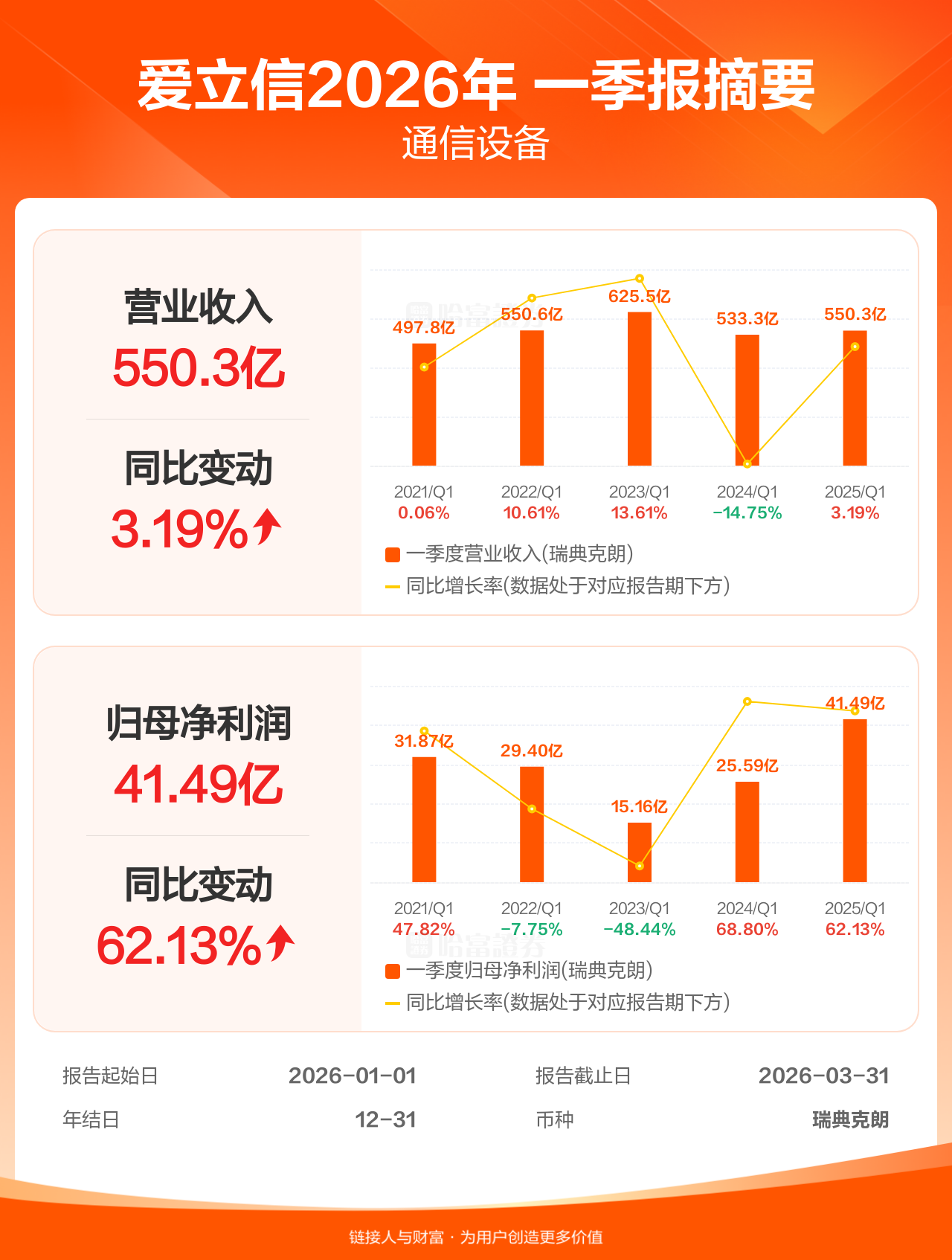 爱立信4月17日发布一季报业绩,截至2026年3月31日的3个月内,该公司营业收入493.32亿瑞典克朗,同比减少10.35%;公司权益持有人应占溢利(归母净利润)8.88亿瑞典克朗,同比减少78.60%。