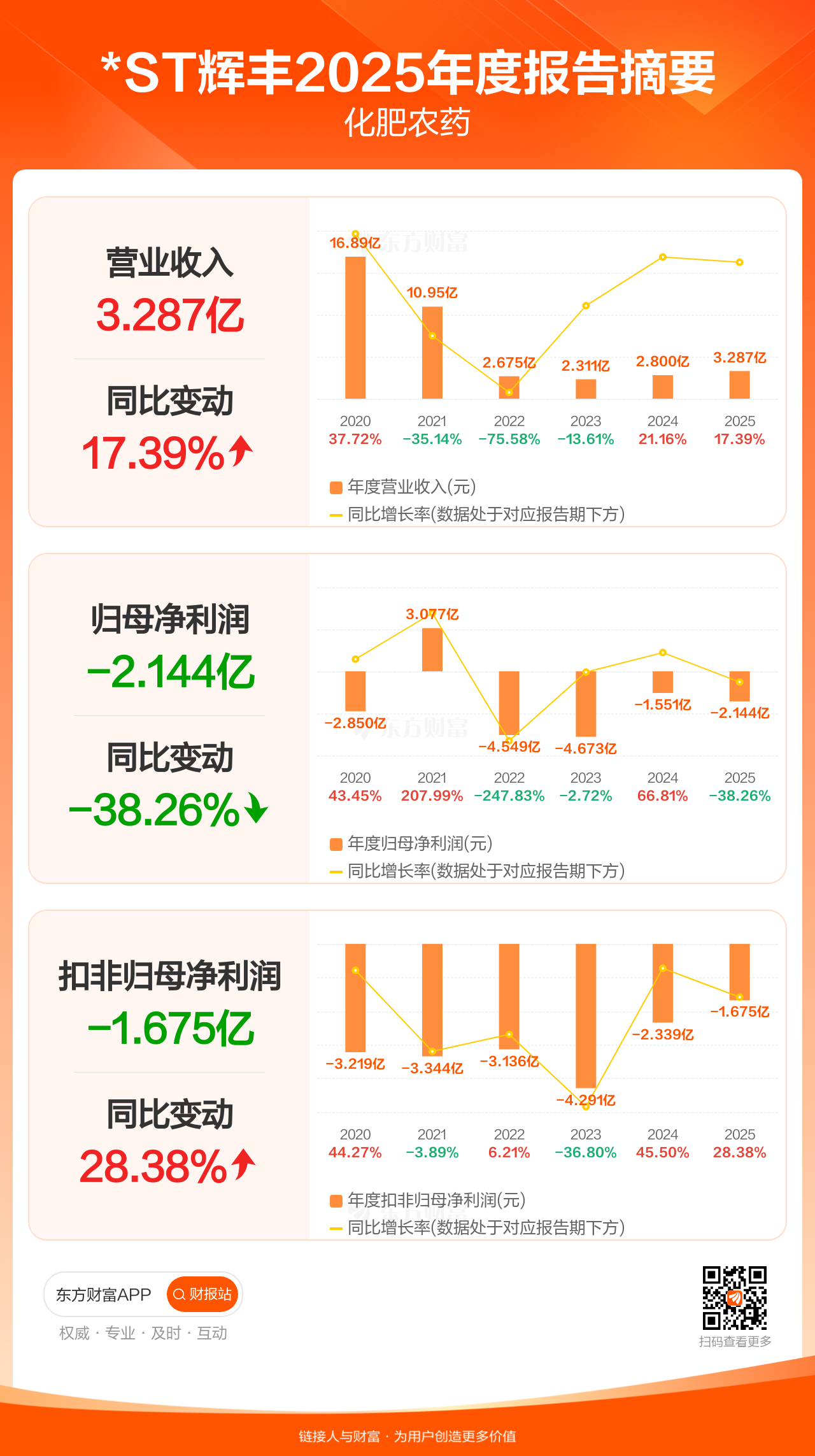 *ST辉丰4月18日发布2025年年报显示,公司全年实现营业收入3.29亿元,同比增长17.39%;归母净利润-2.14亿元;扣非归母净利润-1.67亿元。