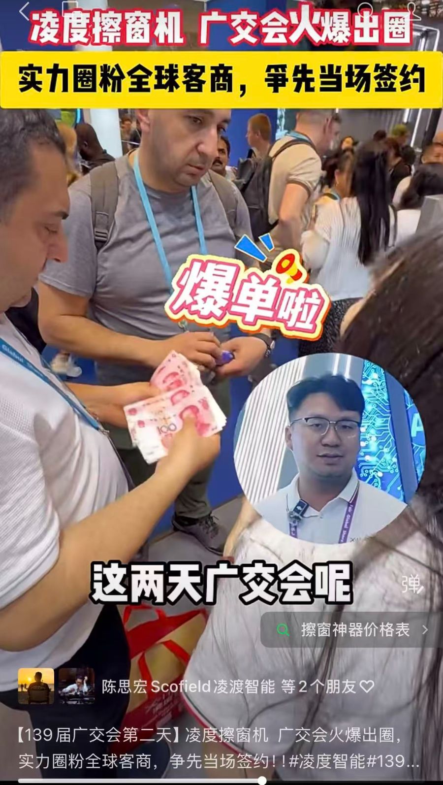 开幕首日,凌度智能凭借新品家用擦窗机器人“小飞侠”成功拿到“开门红”:意向合作数量达到数万台,甚至有采购商现场支付人民币现金,几个去年还没有出口业务的国家,其采购商也趁着本届广交会前来展位询盘。