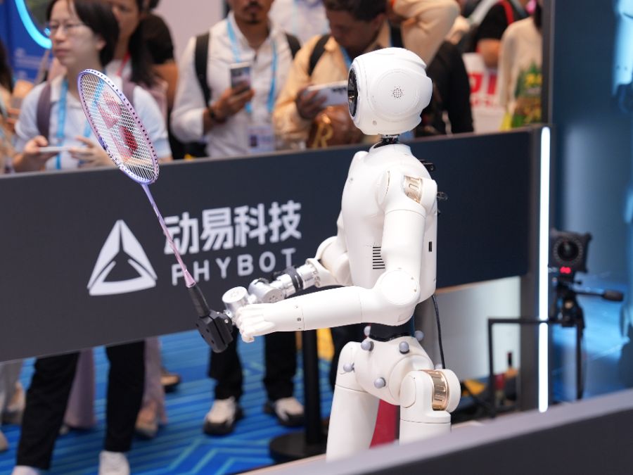 图为动易科技人形机器人PHYBOT C2在打羽毛球。
