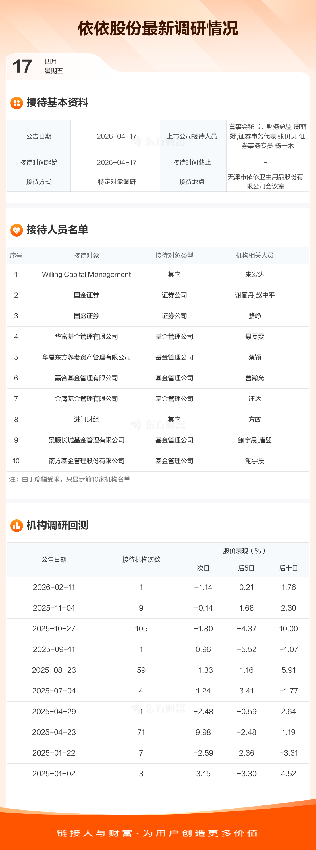 依依股份4月17日公告称,4月17日接待Willing Capital Management等42家机构调研。接待人员包括董事会秘书、财务总监 周丽娜,证券事务代表 张贝贝,证券事务专员 杨一木。