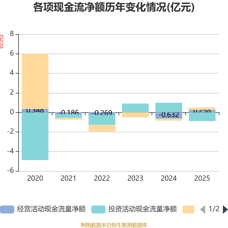截至2025年,公司经营活动现金流净额为2577.85万元,同比增加8896.04万元;筹资活动现金流净额2570.1万元,同比增加4821.38万元;投资活动现金流净额-8951.86万元,上年同期为9884.46万元。