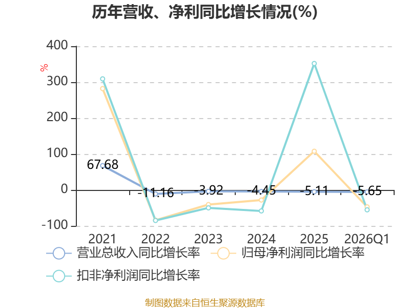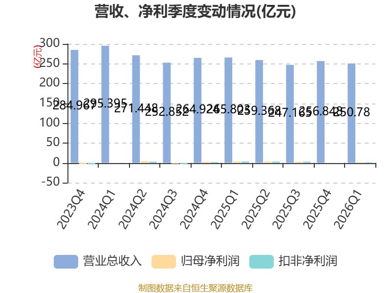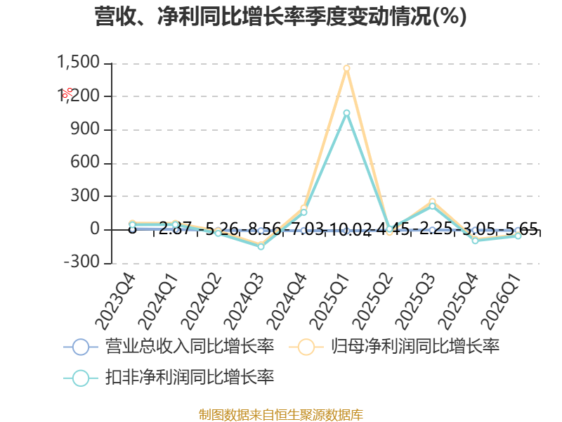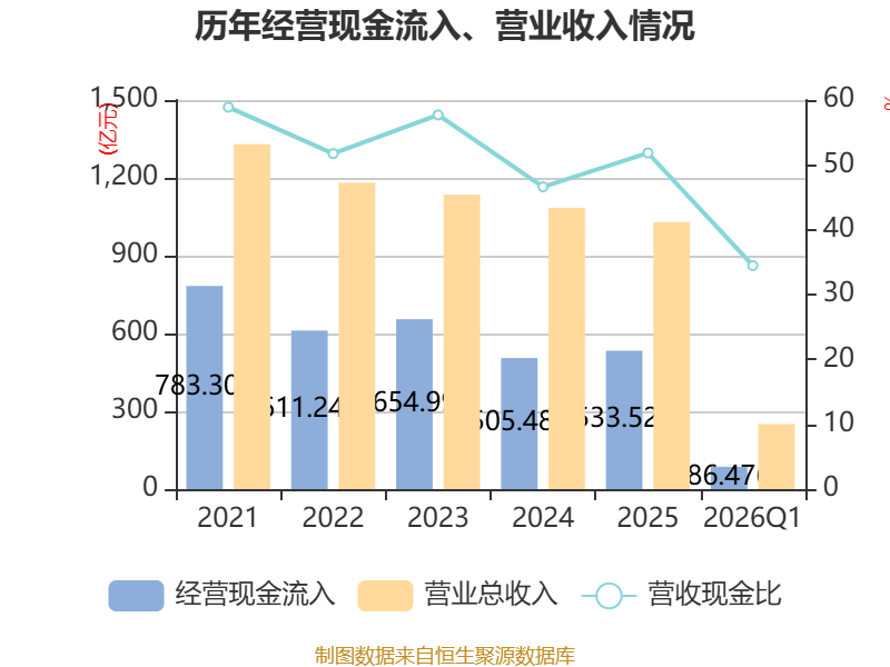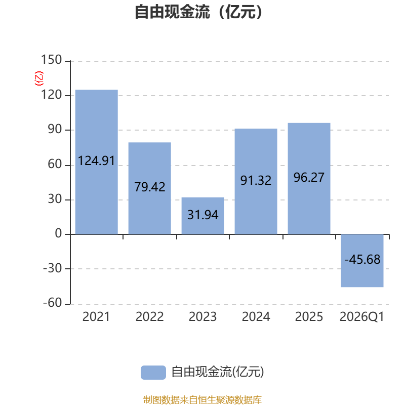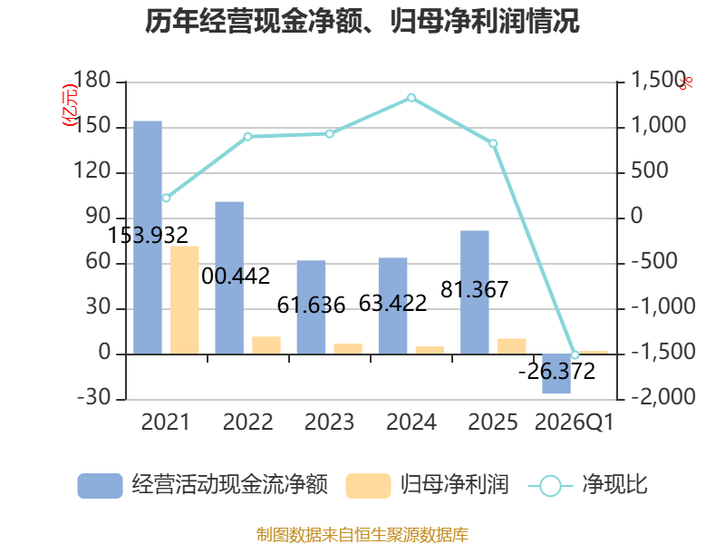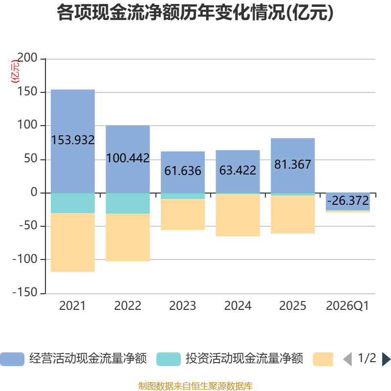 截至2026年一季度末,公司经营活动现金流净额为-26.37亿元,同比减少14.02亿元;筹资活动现金流净额-2.45亿元,同比增加13.5亿元;投资活动现金流净额-7025.68万元,上年同期为-7627.24万元。
