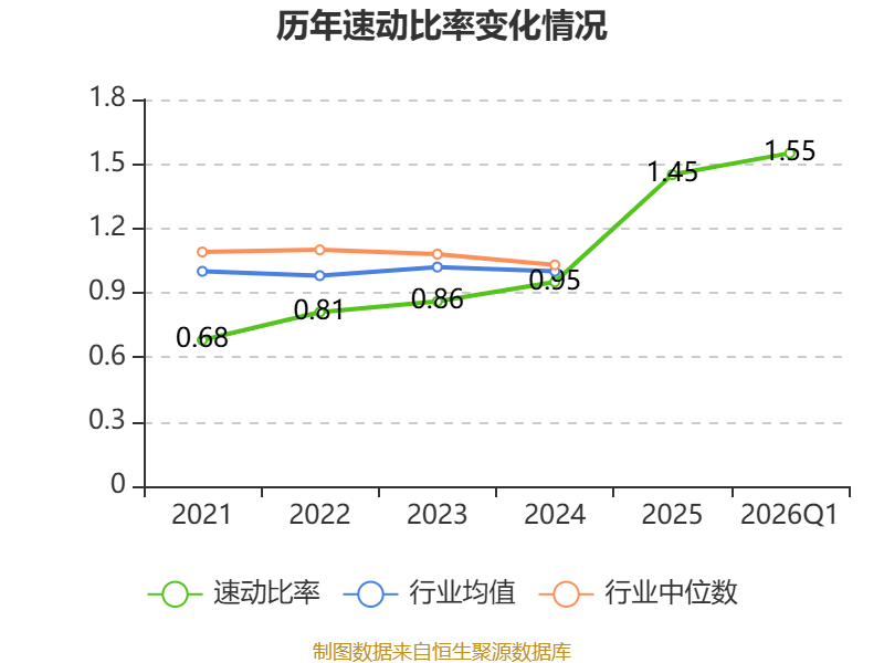 2026年第一季度,公司流动比率为1.65,速动比率为1.55。