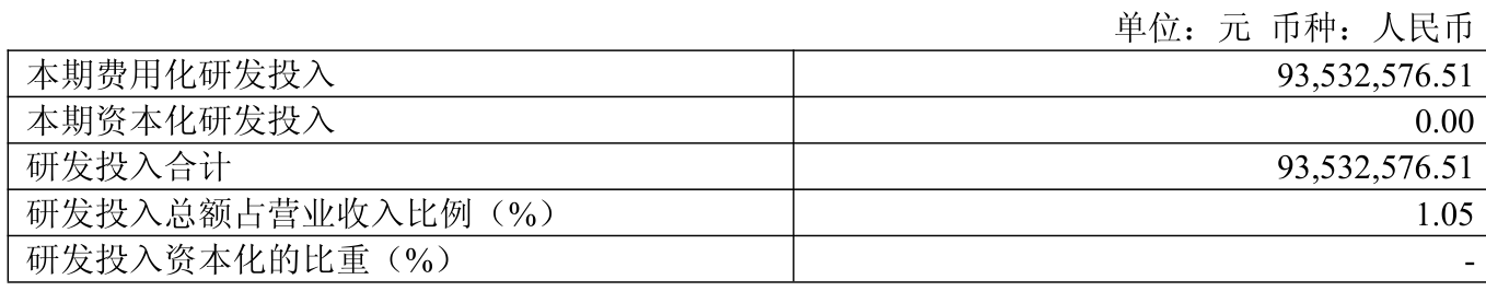 2025年全年,公司研发投入金额为9353.26万元,同比下降8.96%;研发投入占营业收入比例为1.05%,相比上年同期下降0.29个百分点。此外,公司全年研发投入资本化率为0%。