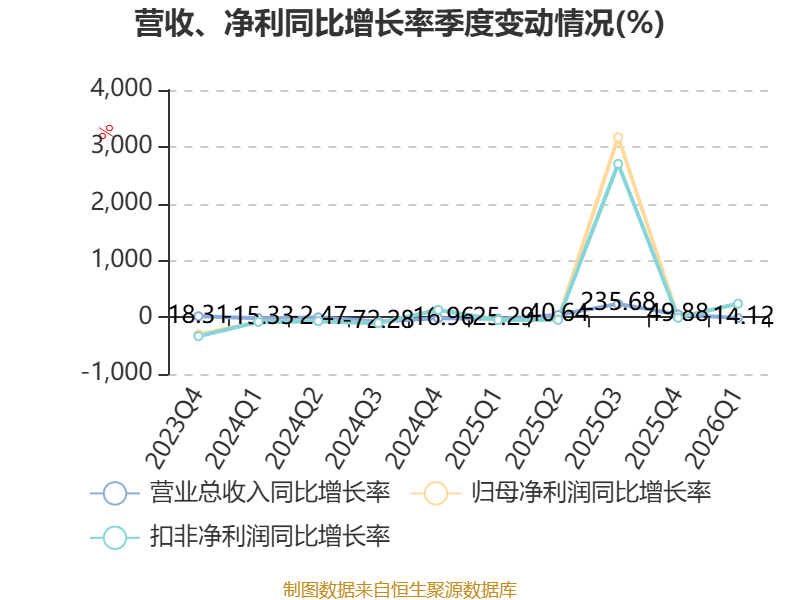 中证智能财讯世荣兆业(002016)4月18日披露2026年第一季度报告。公司实现营业总收入1.63亿元,同比下降14.12%;归母净利润2060.23万元,同比增长238.52%;扣非净利润2058.56万元,同比增长240.90%;经营活动产生的现金流量净额为242.41万元,同比下降76.85%;报告期内,世荣兆业基本每股收益为0.0255元,加权平均净资产收益率为0.42%。