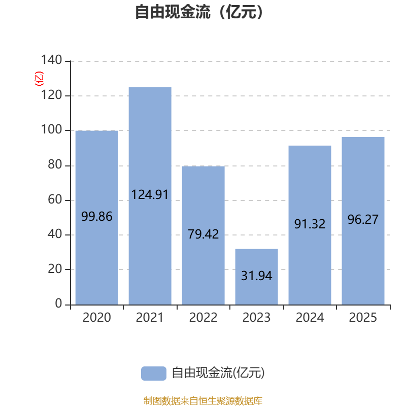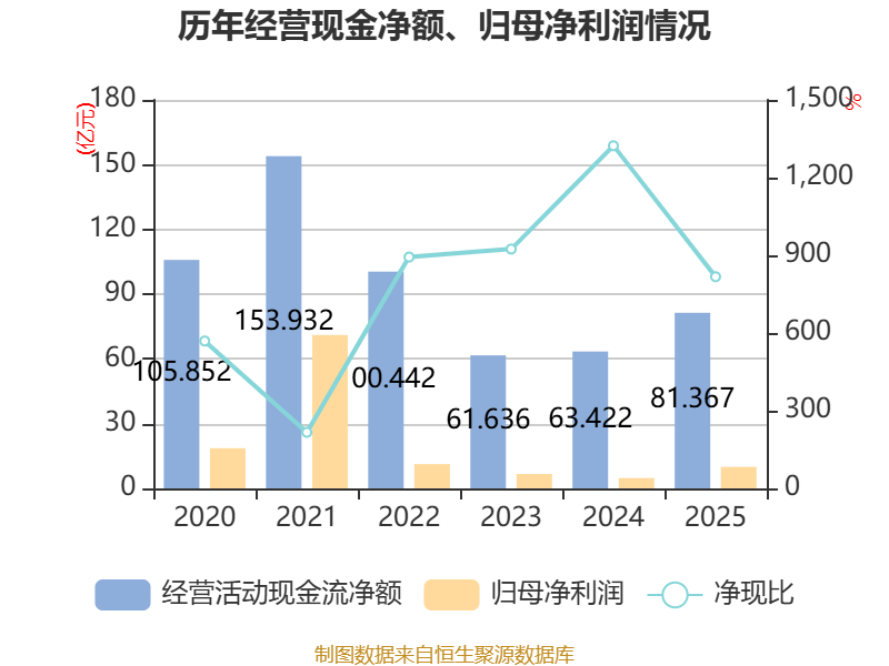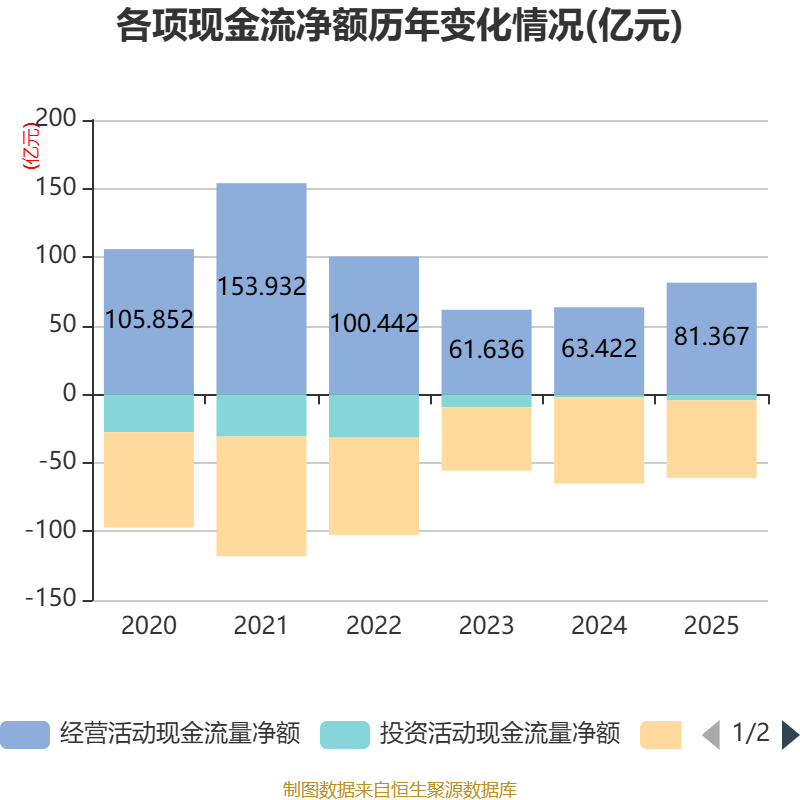 截至2025年,公司经营活动现金流净额为81.37亿元,同比增长28.29%;筹资活动现金流净额-56.46亿元,同比增加6.48亿元;投资活动现金流净额-4.46亿元,上年同期为-2.18亿元。
