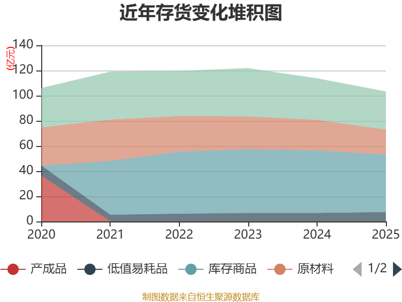 从存货变动来看,截至2025年末,公司存货账面价值为103.3亿元,占净资产的20.52%,较上年末减少10.41亿元。其中,存货跌价准备为2.76亿元,计提比例为2.6%。