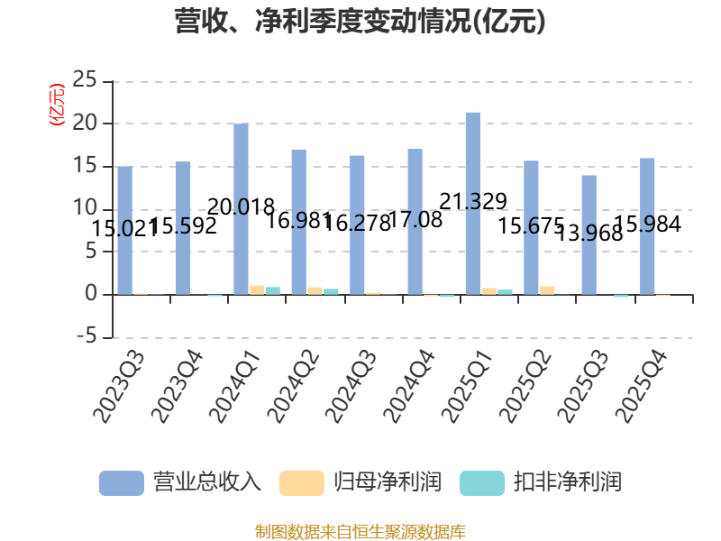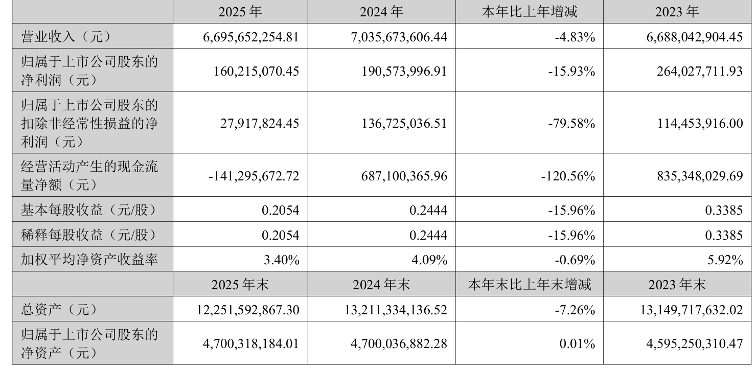 中证智能财讯合百集团(000417)4月18日披露2025年年度报告。2025年,公司实现营业总收入66.96亿元,同比下降4.83%;归母净利润1.6亿元,同比下降15.93%;扣非净利润2791.78万元,同比下降79.58%;经营活动产生的现金流量净额为-1.41亿元,上年同期为6.87亿元;报告期内,合百集团基本每股收益为0.2054元,加权平均净资产收益率为3.40%。公司2025年度分配预案为:拟向全体股东每10股派现0.65元(含税)。