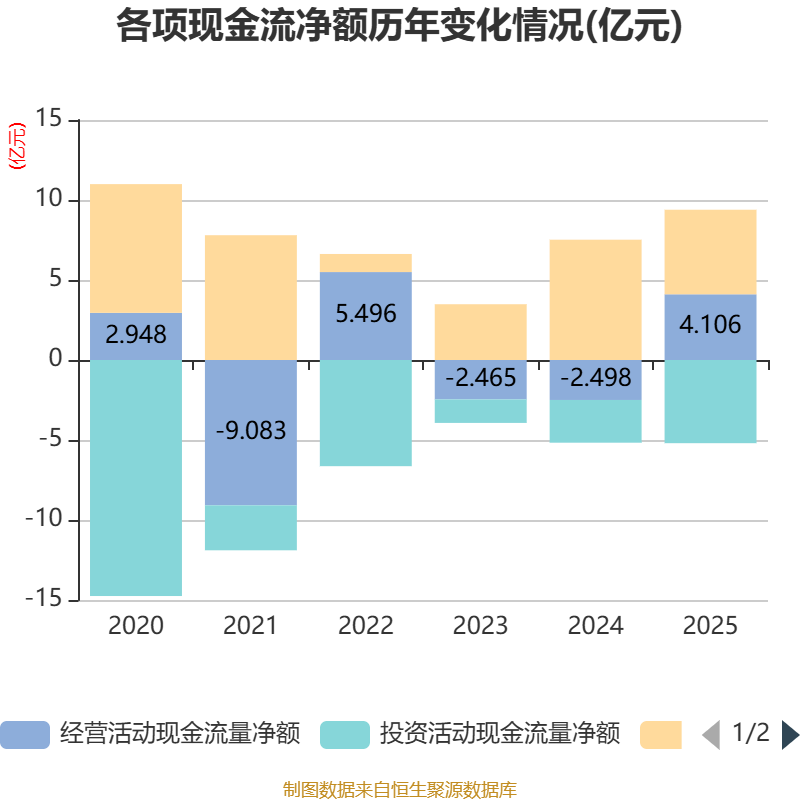 截至2025年,公司经营活动现金流净额为4.11亿元,同比增加6.6亿元;筹资活动现金流净额5.29亿元,同比减少2.23亿元;投资活动现金流净额-5.2亿元,上年同期为-2.67亿元。