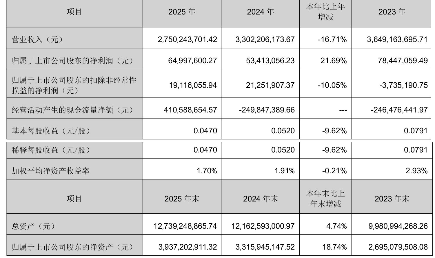 中证智能财讯漳州发展(000753)4月18日披露2025年年度报告。2025年,公司实现营业总收入27.5亿元,同比下降16.71%;归母净利润6499.76万元,同比增长21.69%;扣非净利润1911.61万元,同比下降10.05%;经营活动产生的现金流量净额为4.11亿元,上年同期为-2.5亿元;报告期内,漳州发展基本每股收益为0.047元,加权平均净资产收益率为1.70%。公司2025年度分配预案为:拟向全体股东每10股派现0.15元(含税)。