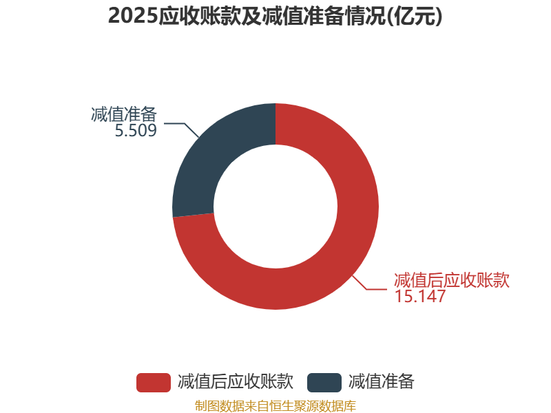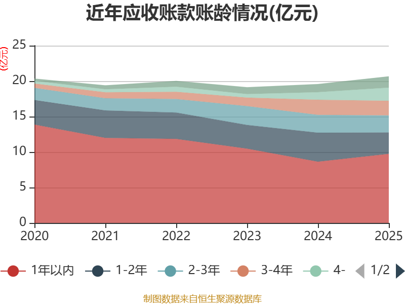 从应收账款账龄结构来看,截至2025年末,公司账龄在1年以内的应收账款余额为9.73亿元,较上年末增长1.11亿元,占应收账款总额比例为47.12%,较上年末上升3.04个百分点。