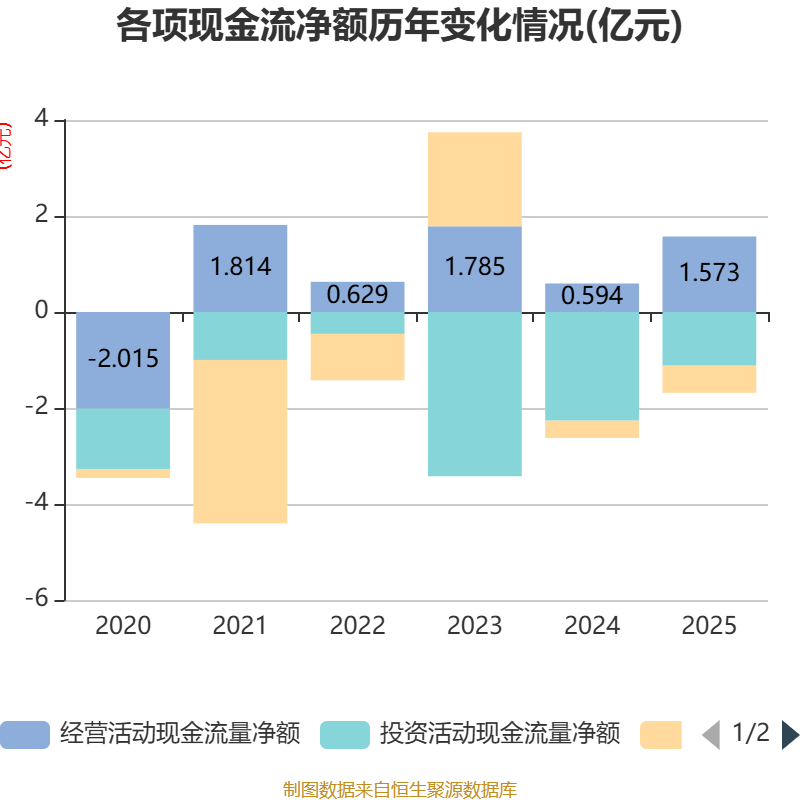 截至2025年,公司经营活动现金流净额为1.57亿元,同比增长164.78%;筹资活动现金流净额-5656.42万元,同比减少2051.05万元;投资活动现金流净额-1.12亿元,上年同期为-2.26亿元。
