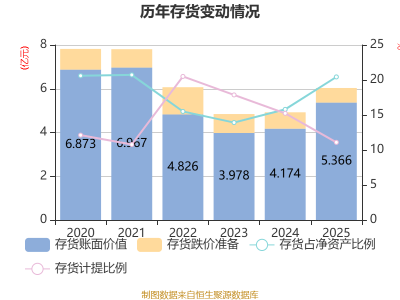 从存货变动来看,截至2025年末,公司存货账面价值为5.37亿元,占净资产的20.44%,较上年末增加1.19亿元。其中,存货跌价准备为6689.74万元,计提比例为11.09%。