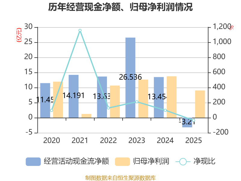 截至2025年,公司经营活动现金流净额为-3.21亿元,同比减少16.66亿元;筹资活动现金流净额-9.02亿元,同比减少200.97万元;投资活动现金流净额4.51亿元,上年同期为-22.63亿元。