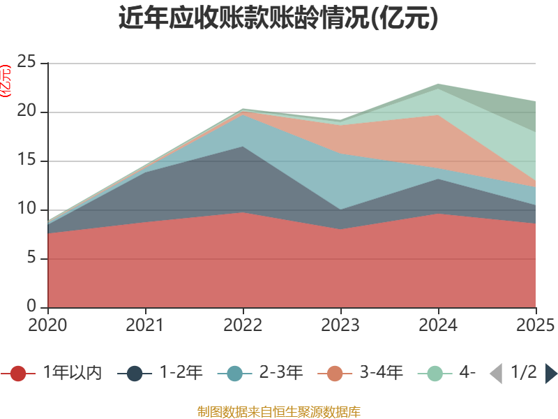 从应收账款账龄结构来看,截至2025年末,公司账龄在1年以内的应收账款余额为8.55亿元,较上年末下降1.01亿元,占应收账款总额比例为40.61%,较上年末下降1.22个百分点。
