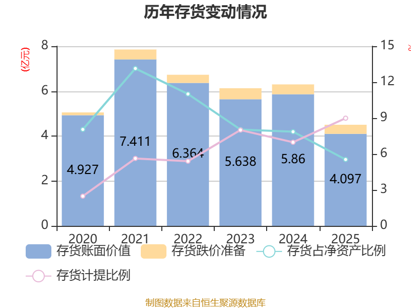 从存货变动来看,截至2025年末,公司存货账面价值为4.1亿元,占净资产的5.54%,较上年末减少1.76亿元。其中,存货跌价准备为4047.82万元,计提比例为8.99%。