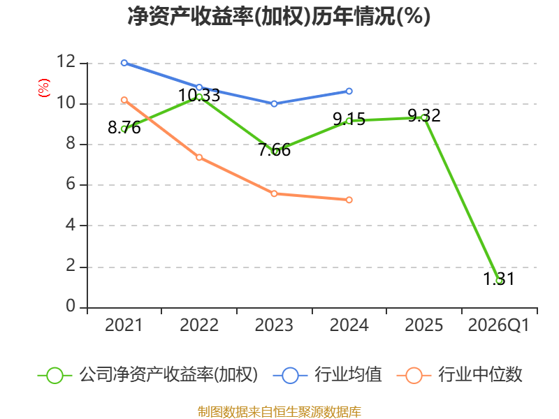 盈利能力方面, 2026年一季度公司加权平均净资产收益率为1.31%,同比上升0.26个百分点。公司2026年第一季度投入资本回报率为1.03%,较上年同期上升0.2个百分点。