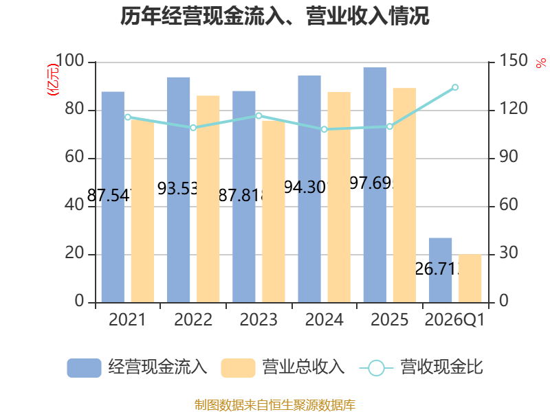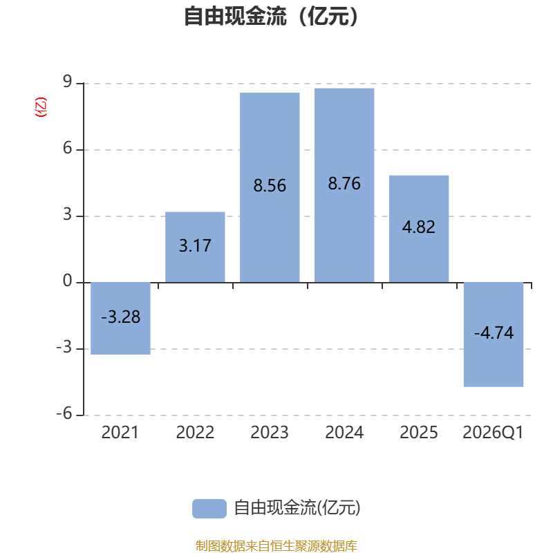 截至2026年一季度末,公司经营活动现金流净额为8099.62万元,同比下降87.14%;筹资活动现金流净额6.45亿元,同比增加7.95亿元;投资活动现金流净额-3.14亿元,上年同期为-2.85亿元。