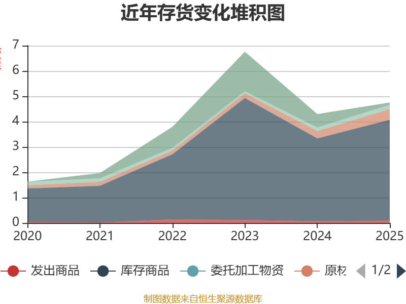从存货变动来看,截至2025年末,公司存货账面价值为4.75亿元,占净资产的24.72%,较上年末增加4569.76万元。其中,存货跌价准备为3591.7万元,计提比例为7.03%。
