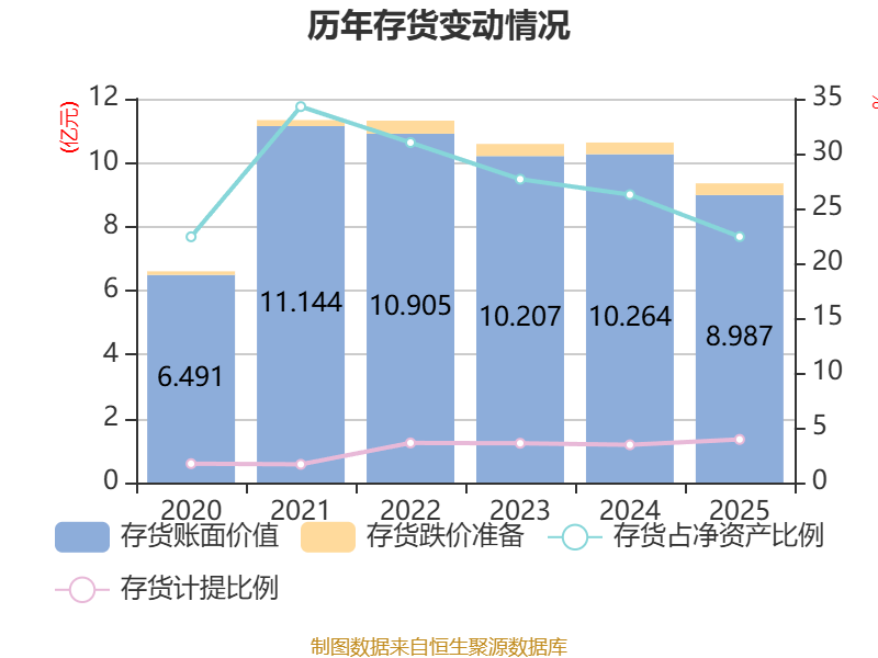 从存货变动来看,截至2025年末,公司存货账面价值为8.99亿元,占净资产的22.42%,较上年末减少1.28亿元。其中,存货跌价准备为3673.47万元,计提比例为3.93%。