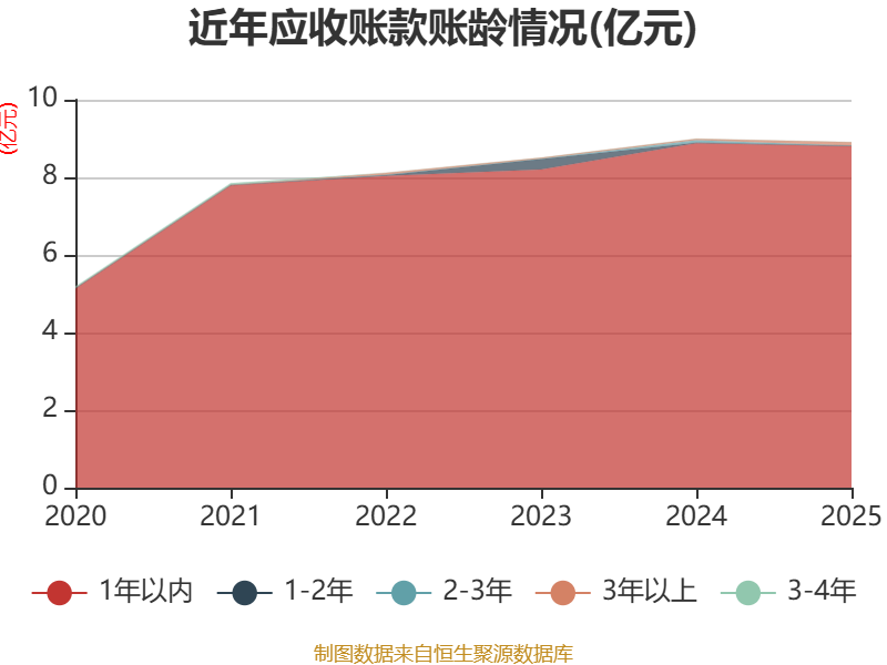 从应收账款账龄结构来看,截至2025年末,公司账龄在1年以内的应收账款余额为8.8亿元,较上年末下降835.44万元,占应收账款总额比例为98.81%,较上年末上升0.05个百分点。