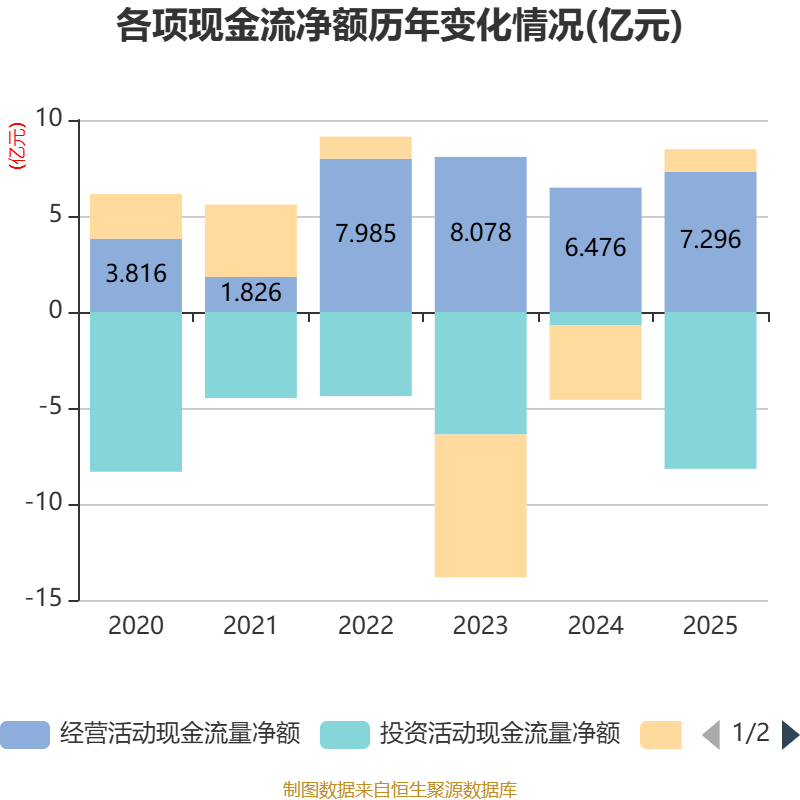 截至2025年,公司经营活动现金流净额为7.3亿元,同比增长12.67%;筹资活动现金流净额1.18亿元,同比增加5.06亿元;投资活动现金流净额-8.17亿元,上年同期为-6936.67万元。