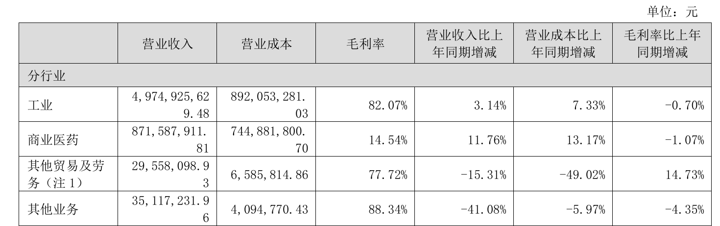工业毛利率高达82.07%但微降0.70个百分点,商业医药毛利率仅14.54%且下滑1.07个百分点,其他贸易及劳务毛利率大幅攀升14.73个百分点,其他业务毛利率88.34%但下降4.35个百分点,整体盈利质量呈结构性分化。