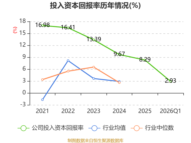 盈利能力方面, 2026年一季度公司加权平均净资产收益率为2.77%,同比上升0.01个百分点。公司2026年第一季度投入资本回报率为2.93%,较上年同期上升0.1个百分点。