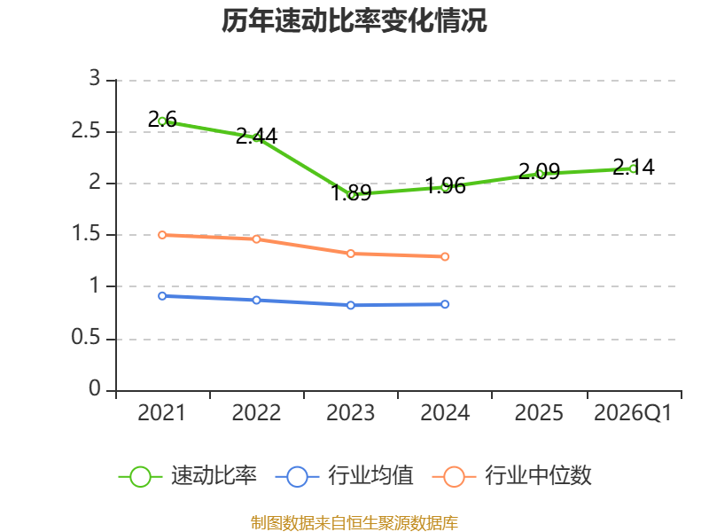 2026年第一季度,公司流动比率为2.15,速动比率为2.14。