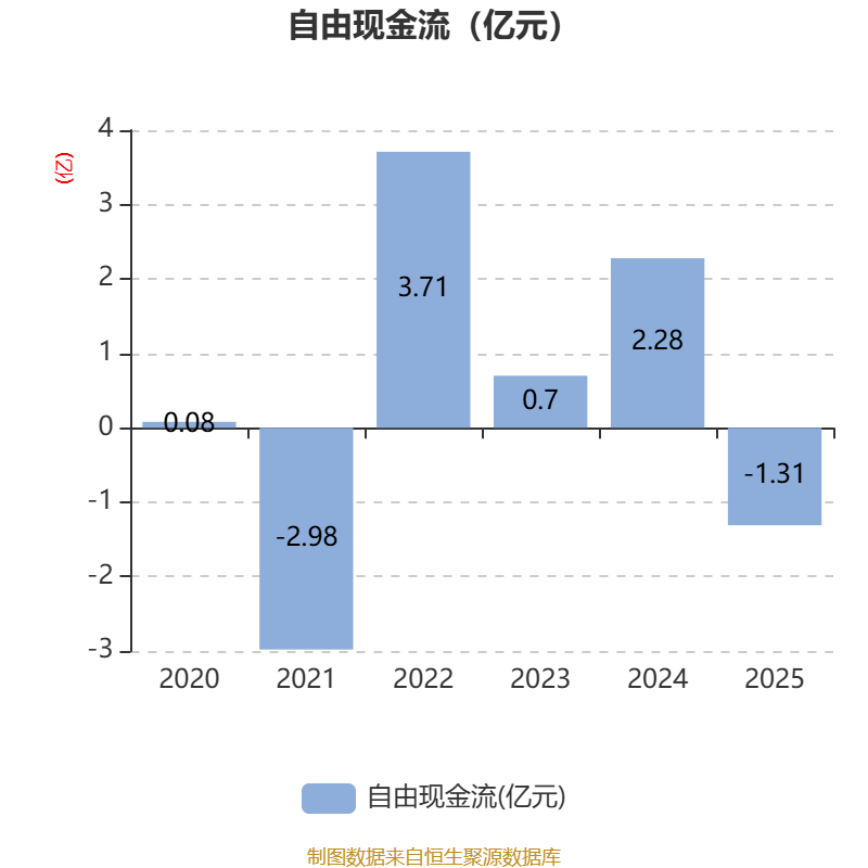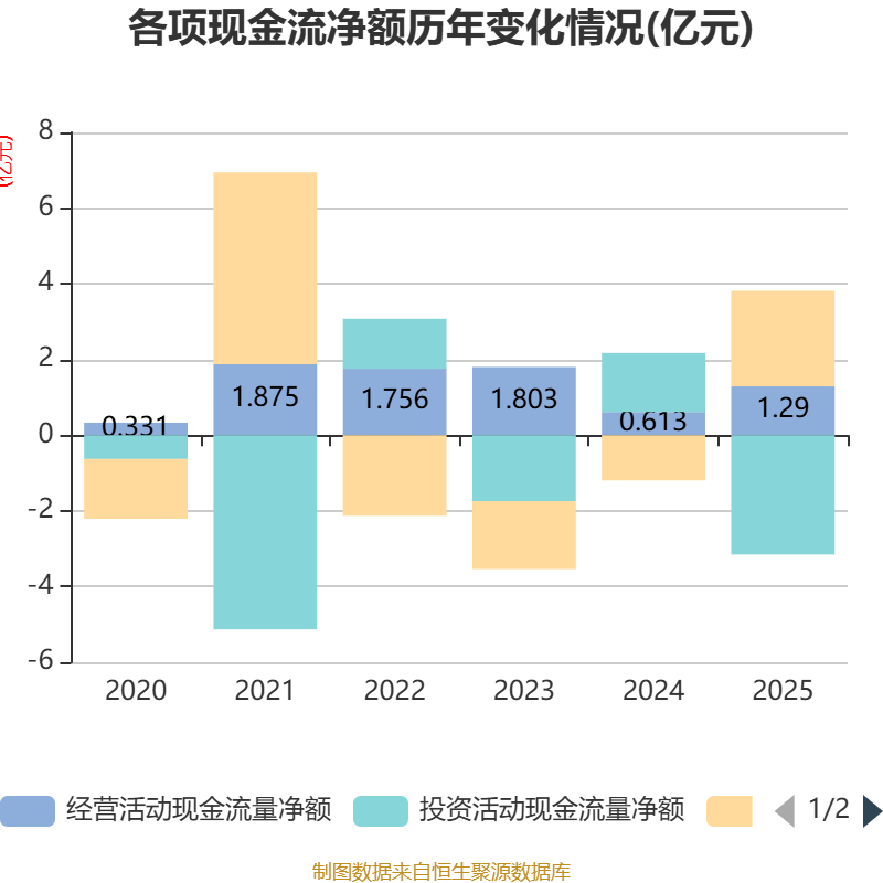 截至2025年,公司经营活动现金流净额为1.29亿元,同比增长110.49%;筹资活动现金流净额2.53亿元,同比增加3.72亿元;投资活动现金流净额-3.15亿元,上年同期为1.56亿元。
