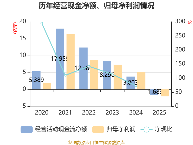 截至2025年,公司经营活动现金流净额为-1.69亿元,同比减少5.49亿元;筹资活动现金流净额2618.65万元,同比增加6.02亿元;投资活动现金流净额-5.14亿元,上年同期为1.47亿元。