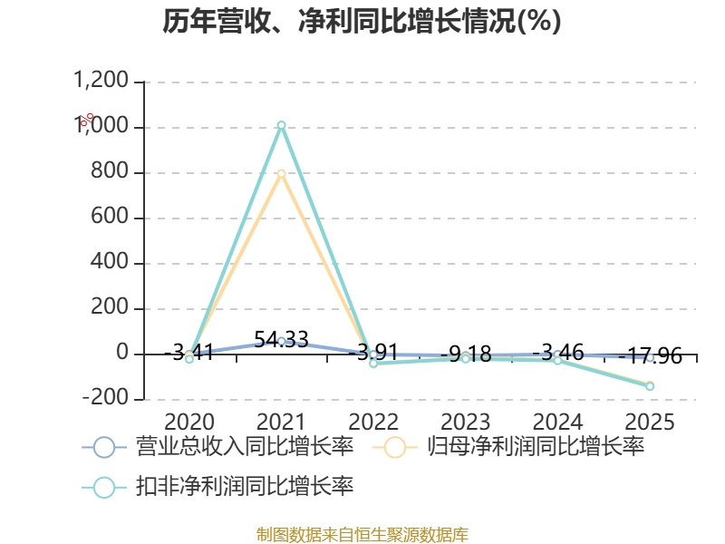 中证智能财讯华昌化工(002274)4月18日披露2025年年度报告。2025年,公司实现营业总收入65.06亿元,同比下降17.96%;归母净利润亏损2.04亿元,上年同期盈利5.21亿元;扣非净利润亏损2.15亿元,上年同期盈利4.8亿元;经营活动产生的现金流量净额为-1.69亿元,上年同期为3.8亿元;报告期内,华昌化工基本每股收益为-0.2146元,加权平均净资产收益率为-3.73%。公司2025年度分配预案为:拟向全体股东每10股派现1元(含税)。