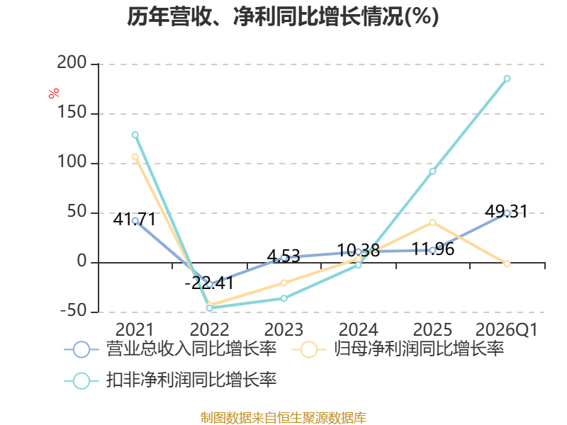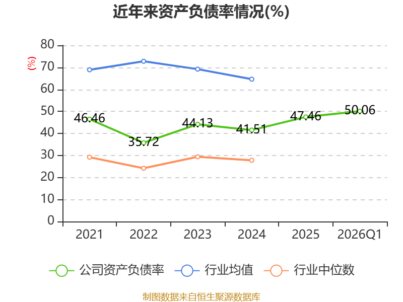负债重大变化方面,截至2026年一季度末,公司一年内到期的非流动负债较上年末减少69.09%,占公司总资产比重下降2.75个百分点;长期借款较上年末增加126.97%,占公司总资产比重上升2.33个百分点;应付票据及应付账款较上年末增加20.41%,占公司总资产比重上升1.87个百分点;其他应付款(含利息和股利)较上年末增加497.36%,占公司总资产比重上升1.76个百分点。