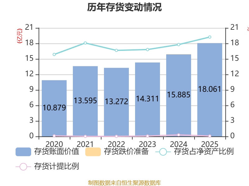从存货变动来看,截至2025年末,公司存货账面价值为18.06亿元,占净资产的19.23%,较上年末增加2.18亿元。其中,存货跌价准备为121.08万元,计提比例为0.07%。