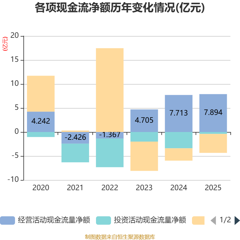 截至2025年,公司经营活动现金流净额为7.89亿元,同比增长2.35%;筹资活动现金流净额-3.95亿元,同比减少1.37亿元;投资活动现金流净额-3993.09万元,上年同期为-3.39亿元。