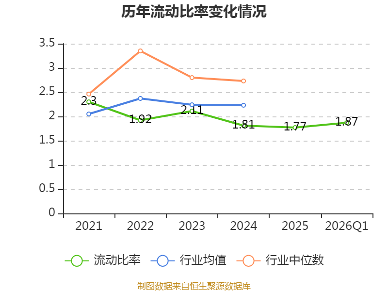 2026年第一季度,公司流动比率为1.87,速动比率为1.75。