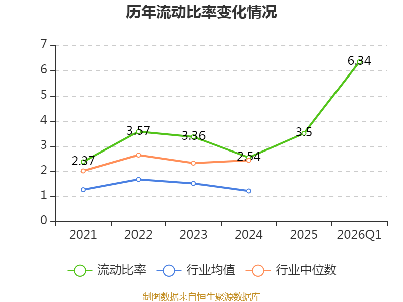 2026年第一季度,公司流动比率为6.34,速动比率为5.71。