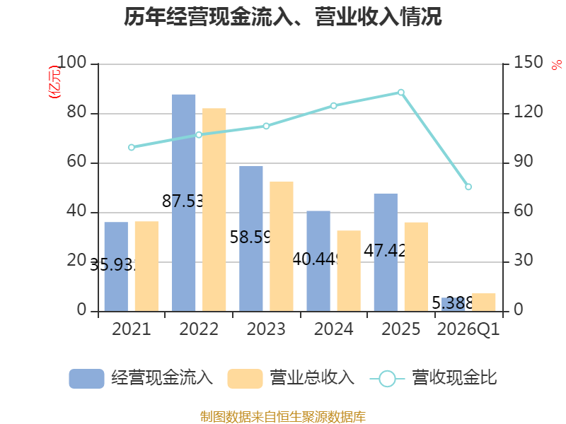 截至2026年一季度末,公司经营活动现金流净额为-7953.89万元,同比减少1.84亿元;筹资活动现金流净额-2.02亿元,同比减少1.42亿元;投资活动现金流净额13.73亿元,上年同期为3523.17万元。