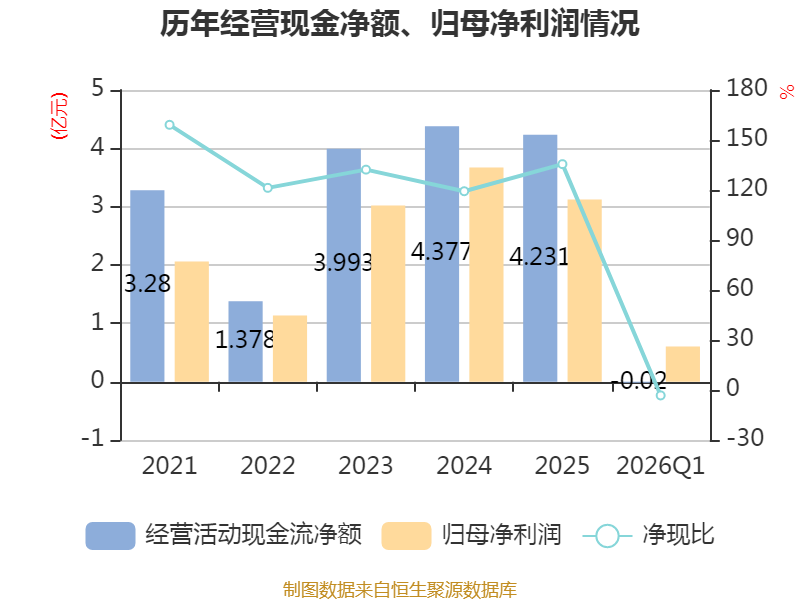 截至2026年一季度末,公司经营活动现金流净额为-195.93万元,同比增加6343.36万元;筹资活动现金流净额-2252.52万元,同比增加1.32亿元;投资活动现金流净额2870.89万元,上年同期为-1.11亿元。