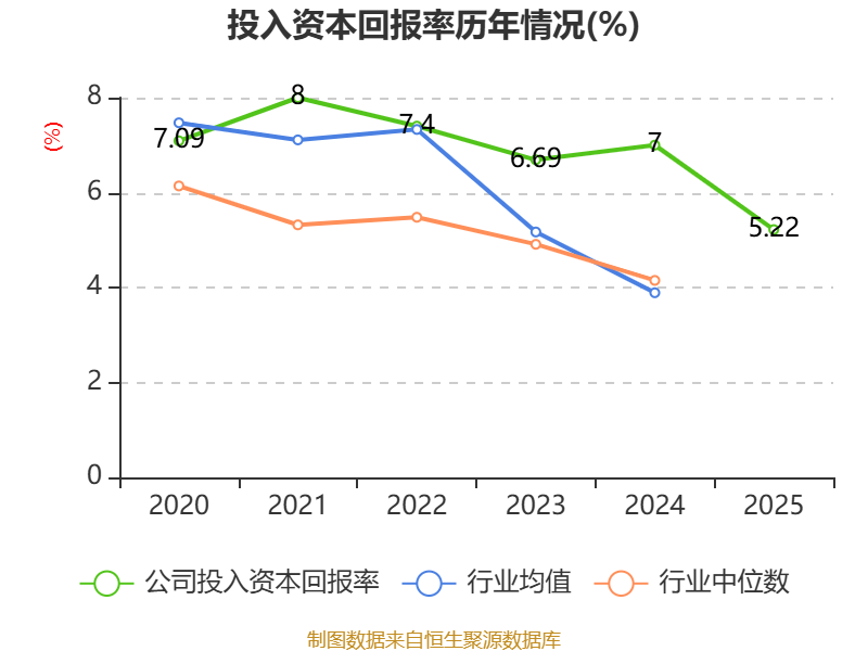 数据显示,2025年公司加权平均净资产收益率为8.35%,较上年同期下降3.48个百分点。公司2025年投入资本回报率为5.22%,较上年同期下降1.78个百分点。