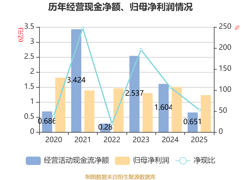 截至2025年,公司经营活动现金流净额为6514.41万元,同比下降59.38%;筹资活动现金流净额-3.04亿元,同比减少2.29亿元;投资活动现金流净额9360.66万元,上年同期为-1.07亿元。