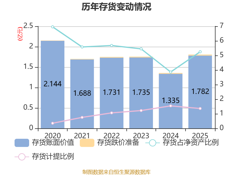从存货变动来看,截至2025年末,公司存货账面价值为1.78亿元,占净资产的5.25%,较上年末增加4466.9万元。其中,存货跌价准备为245.08万元,计提比例为1.36%。
