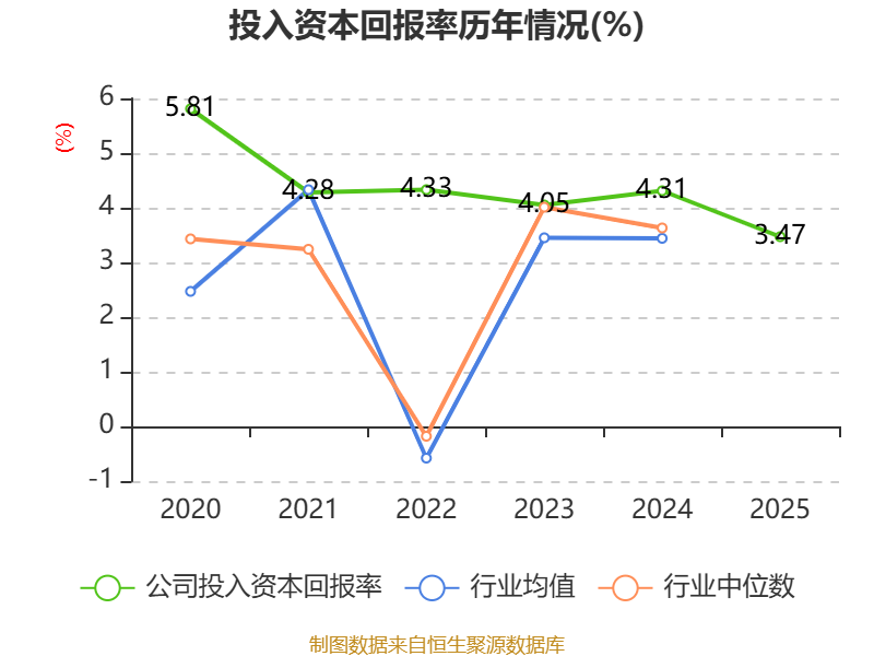 数据显示,2025年公司加权平均净资产收益率为3.59%,较上年同期下降0.93个百分点。公司2025年投入资本回报率为3.47%,较上年同期下降0.84个百分点。